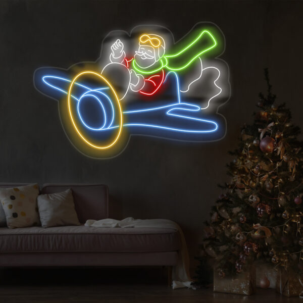 Santa Flying Red Airplane Neon Sign – Merry Christmas LED Sign, Santa Claus Wall Art, Festive LED Light, Christmas House Wall Decor